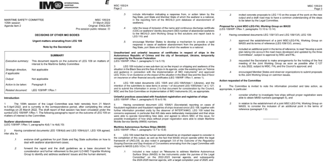 109-та сесія Юридичного комітету IMO (Міжнародна морська організація, International Maritime Organization), яка проходила з 21 березня по 5 квітня 2022 року були розглянуті термінові питання викладені у листі MSC 105/2/4 від 31.03.2022 року.