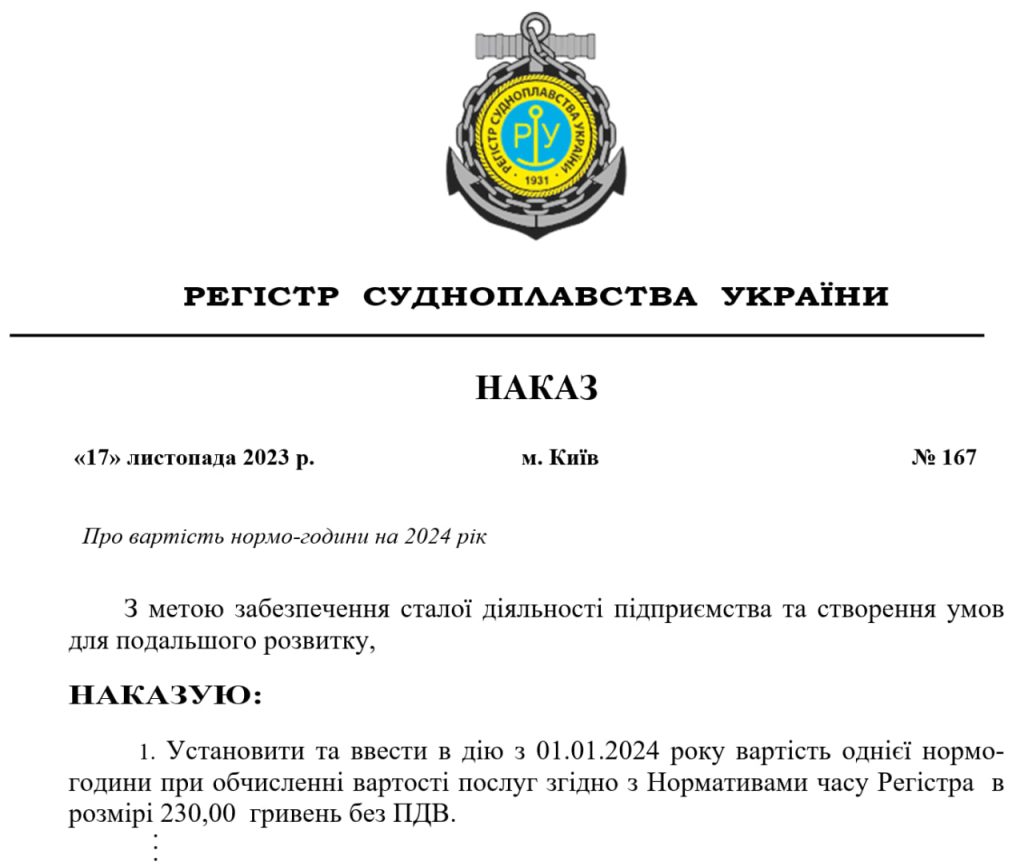 ☝️Інформуємо, що з метою забезпечення сталої діяльності підприємства та створення умов для подальшого розвитку, наказом від 17.11.2023 №167 (надається частково) встановлено та буде введено у дію з 01.01.2024 року вартість однієї нормо-години при обчислені вартості послуг згідно з Нормативами часу Регістра в розмірі 230,00 гривень без ПДВ. Попередній наказ Регістра судноплавства України від 01.12.2022 №92 вважати таким, що втратив чинність з 01.01.2024 року.
