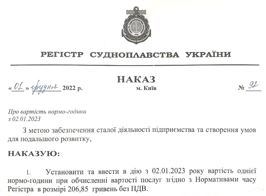 Інформуємо, що з метою забезпечення сталої діяльності підприємства та створення умов для подальшого розвитку, наказом від 01.12.2022 №92 (надається частково) встановлено та буде введено у дію з 02.01.2023 року вартість однієї нормо-години при обчислені вартості послуг згідно з Нормативами часу Регістра в розмірі 206,85 гривень без ПДВ. Попередній наказ Регістра судноплавства України від 10.12.2020 №112 вважати таким, що втратив чинність з 02.01.2023 року.