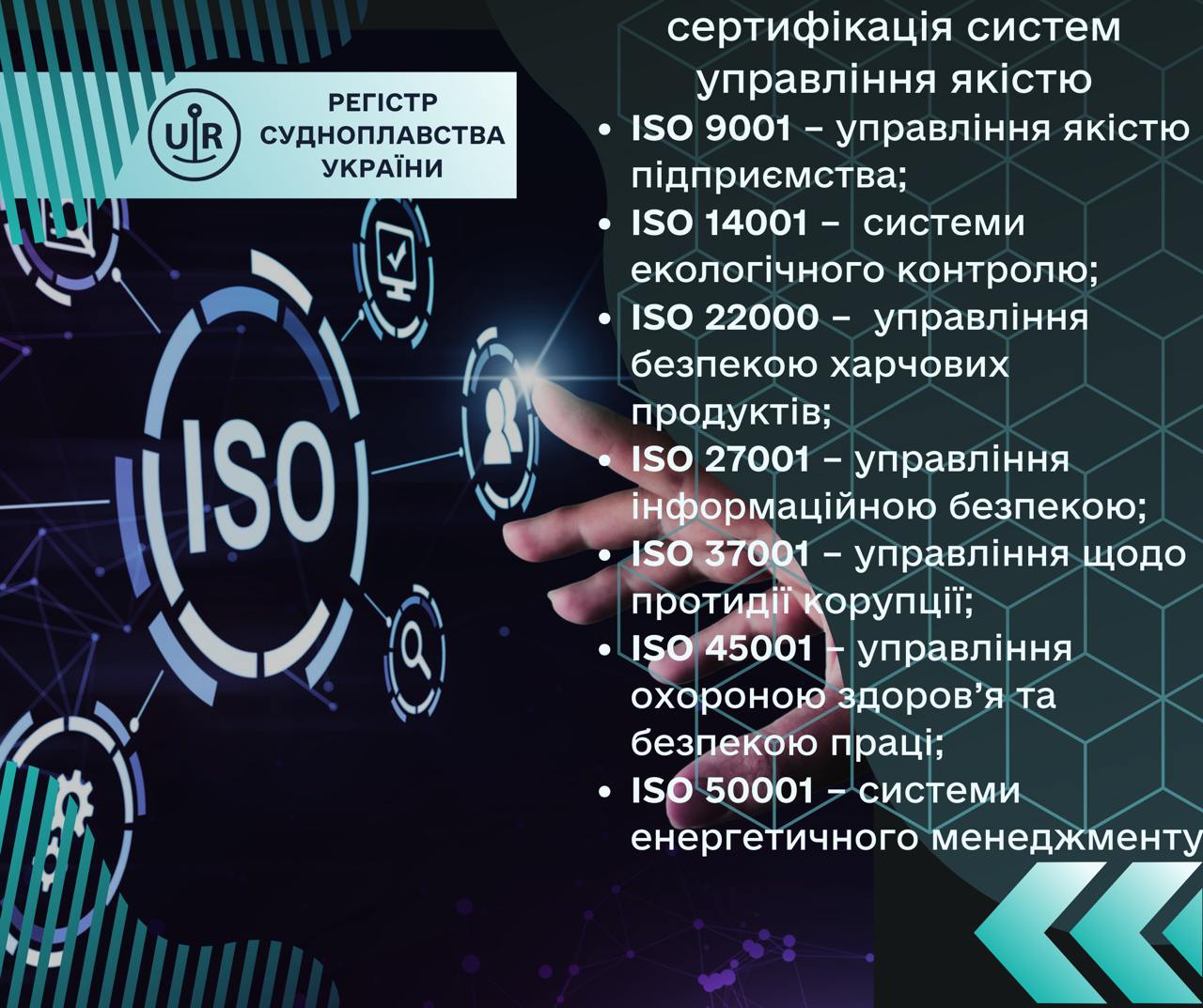 • ISO 45001 – управління охороною здоров’я та безпекою праці;
