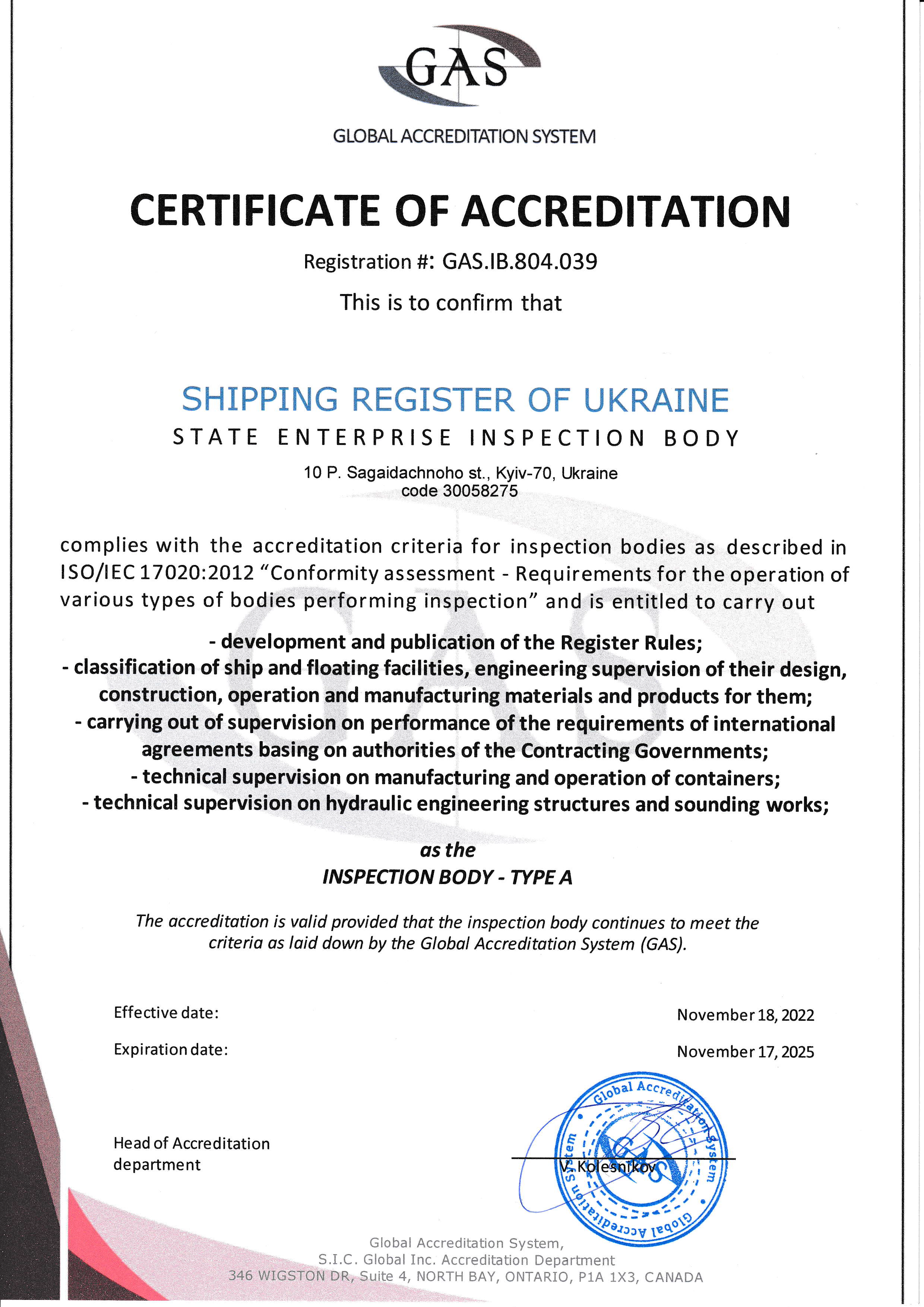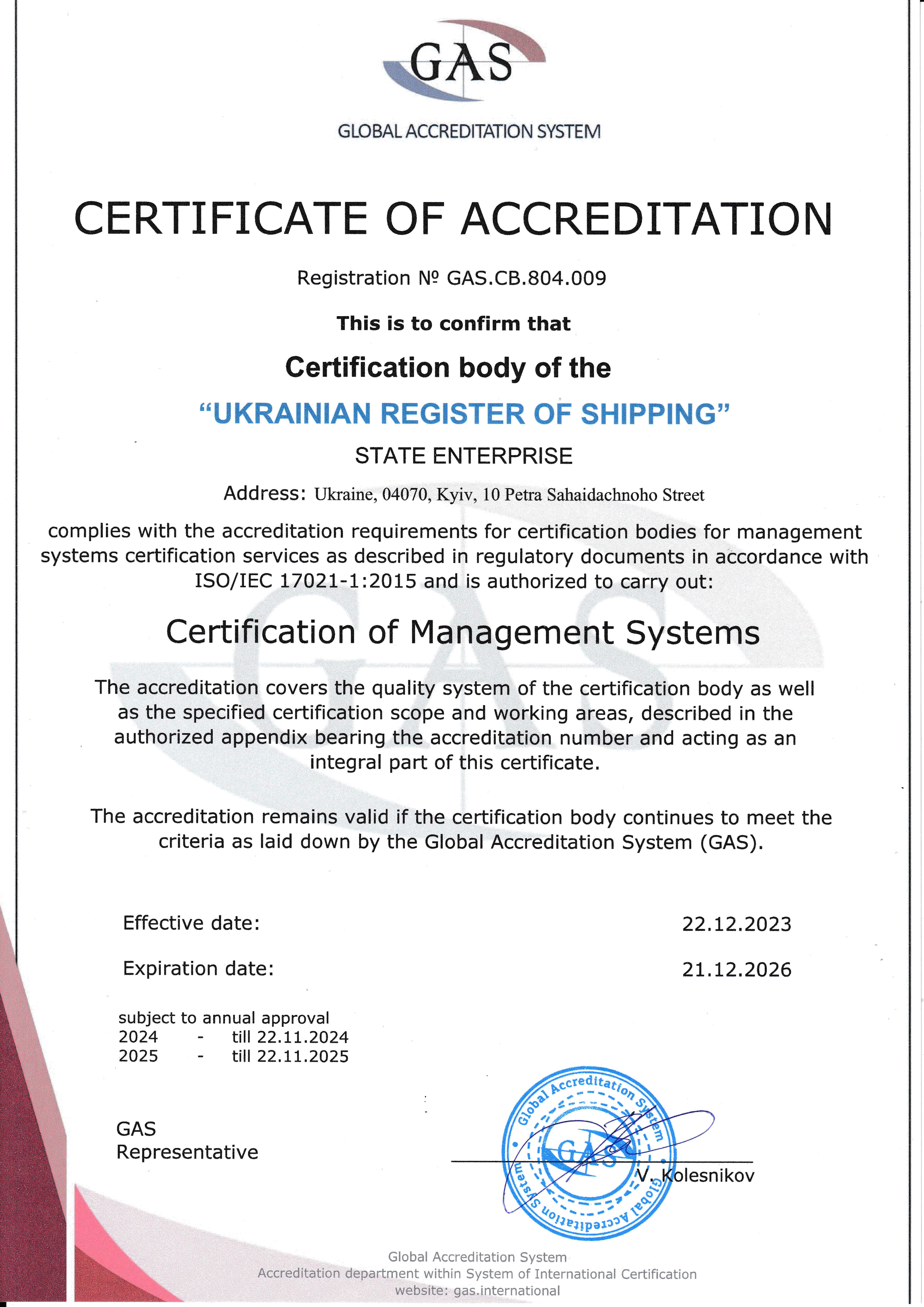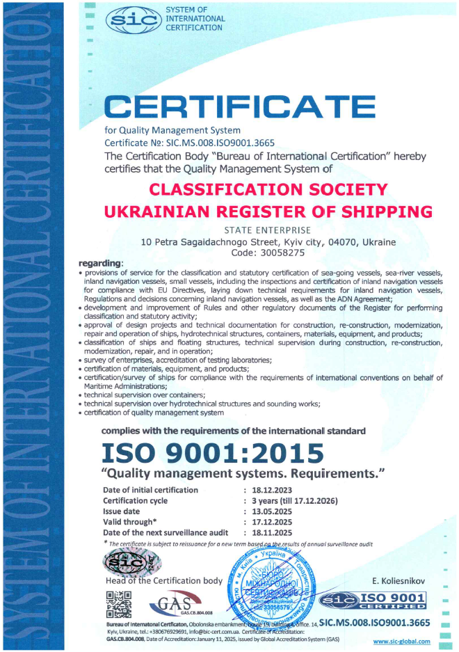 Це свідоцтво дозволяє органу з сертифікації Регістра судноплавства України проводити сертифікацію систем менеджменту згідно сфери нотифікації в системі SIC-GLOBAL.