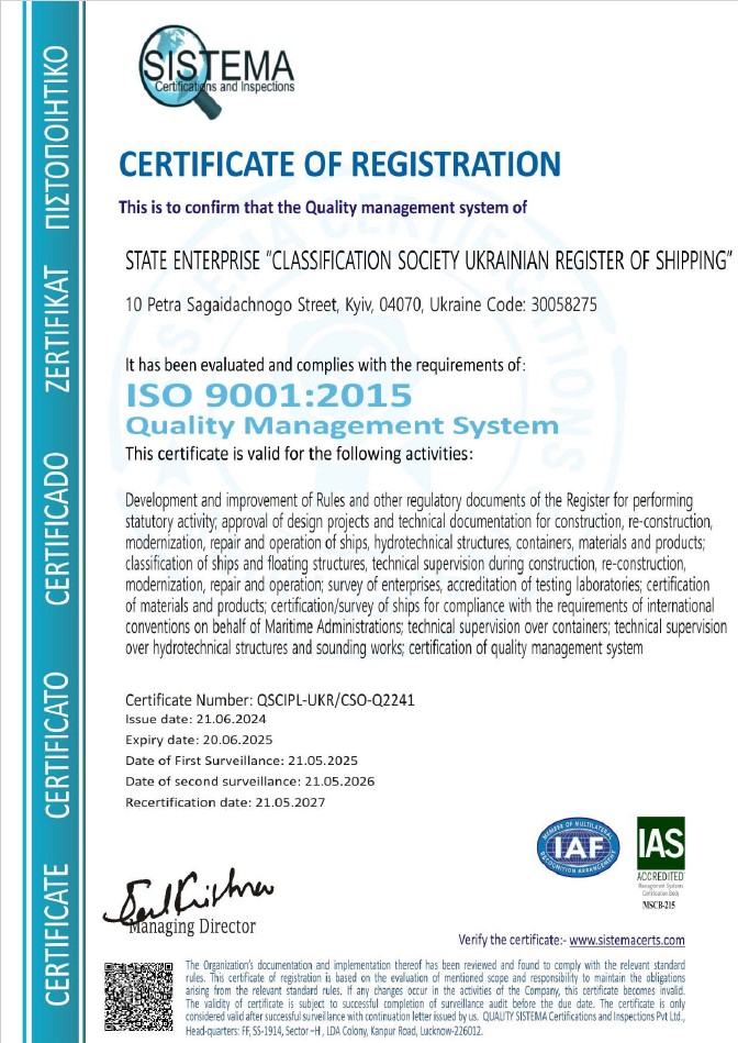 Актуальність сертифіката, а відповідно й діючої системи управління якістю Регістра судноплавства України регулярно підтверджується проведенням щорічного технічного нагляду з боку органу з сертифікації.