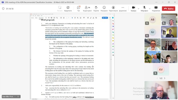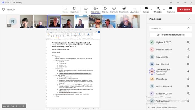 26 березня 2025 року відбулися чергові зустрічі визнаних, відповідно до Європейської угоди з міжнародного перевезення небезпечних вантажів внутрішніми водними шляхами (ВОПНВ/ADN) та Директиви (ЄС) 2016/1629 щодо технічних вимог до суден внутрішнього плавання (ЄС ТВСВП/ES TRIN), класифікаційних товариств. У цих зустрічах взяли участь представники Бюро Верітас (BV), Італійського Регістру (RINA), Норвезького Верітасу (DNV), Регістру Ллойду (LR), Польського Регістру судноплавства (PRS), Хорватського Регістру судноплавства (CRS), голова Комітету з питань безпеки ВОПНВ та представник Німеччини, Регістр судноплавства України (UR) представляв пан Сльозко М.П.